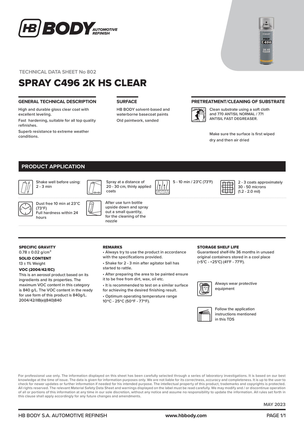 HB Body C496 is a fast-curing 2K HS clear spray ideal for spot repairs, panel repairs, and small refinishing jobs. It delivers durable gloss, strong weather resistance, and professional-grade results without the need for spray gun setup.